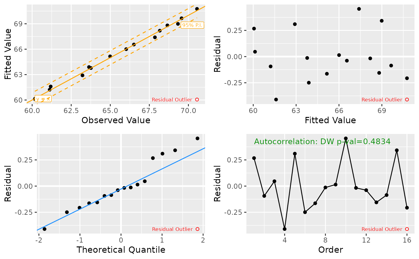 Generates a 4-panel diagnostic plot for a multiple regression model, including: 1) Fitted values vs. observed values (check for non-linearity), 2) Quantile–Quantile plot of residuals (check for non-normality), 3) Residuals vs. fitted values (check for heteroskedasticity), 4) Autocorrelation for time series otherwise influence plot (leverage also available).